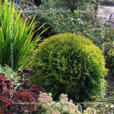 Туя западная Мириам (Mirjam) - компактный шаровидный хвойный кустарник, с яркой золотистой хвоей. Форма была получена случайной мутацией сорта "Danica". Крона плотная и образована густосидящими короткими ветвями. Хвоинки окрашены в золотисто-зеленый цвет, который приобретает на зиму характерный бронзовый оттенок. Любит только солнечные и слегка затененные места, в тени теряет свой цвет и густоту. Туя западная Мириам будет сиять, словно аккуратный золотой камушек в вашем саду. Идеально подходит для японских садов рядом с мраморными фигурками и фонариками, каменистыми композициями. Из неё получится отличный солнечный миксбордер или низкий бордюр. Хорошими компаньонами ей послужат голубые хвойные, плакучие и пурпурные лиственные формы, а также вариегатные цветущие кустарники, розовые кусты с крупными оранжевыми или жёлтыми цветками. Сорт идеален в качестве контейнерной культуры для украшения балконов, парадных зон, беседок и террас.