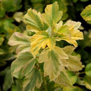 Энис Голд - этот пестролистный сорт пузыреплодника отличается компактным размером куста высотой до 2 м и плотной густооблиственной кроной. Листва мелкая, весной ярко-золотисто-жёлтая, позже жёлто-зелёная или палево-зелёная с бледно-жёлтым кантом.