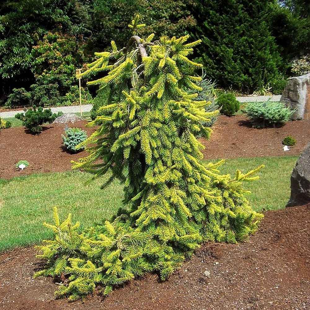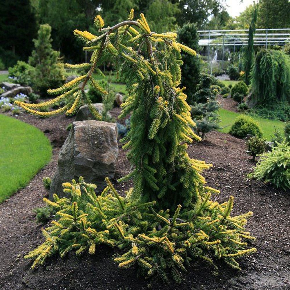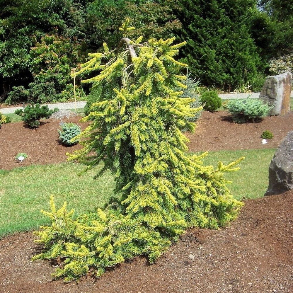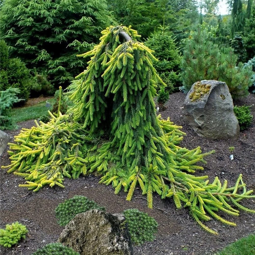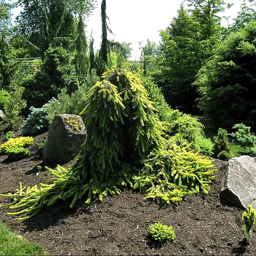 Компактная плакучая ель Голд Дрифт идеально подходит для создания различных композиций на небольших приусадебных участках, а также в альпийских садах и парковых зонах. Она хорошо контрастирует с гравийной мульчей и гармонично смотрится на фоне зеленого травяного газона.