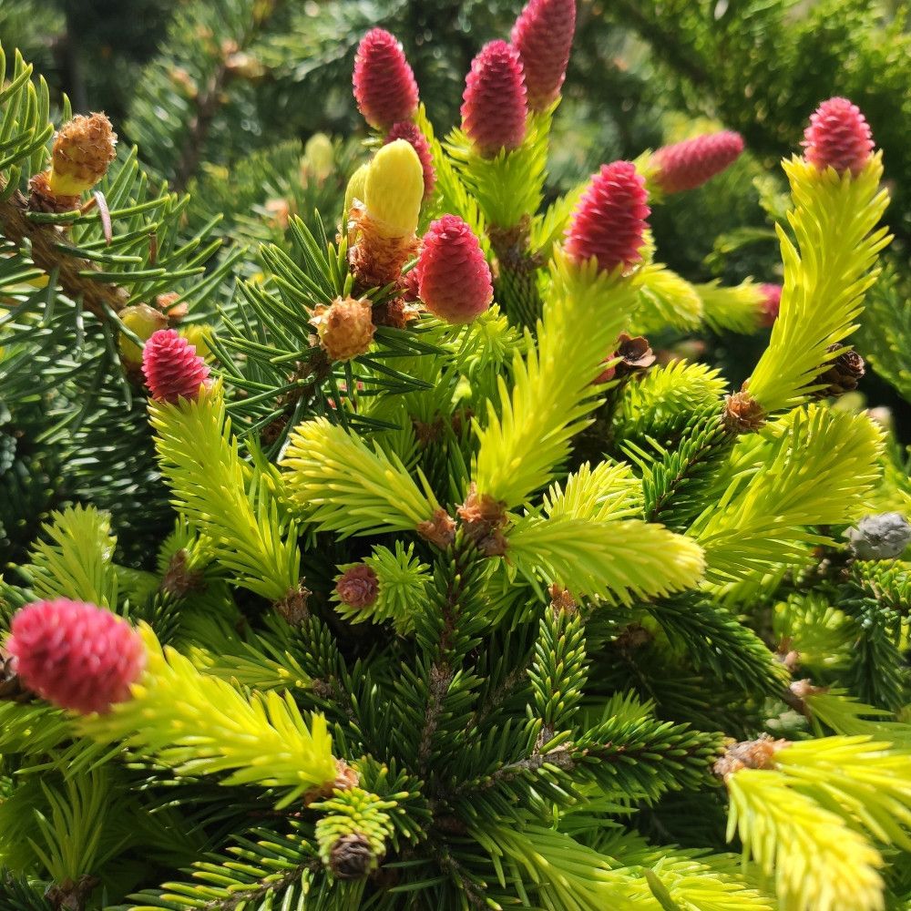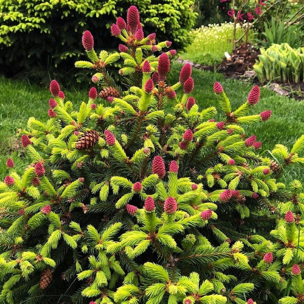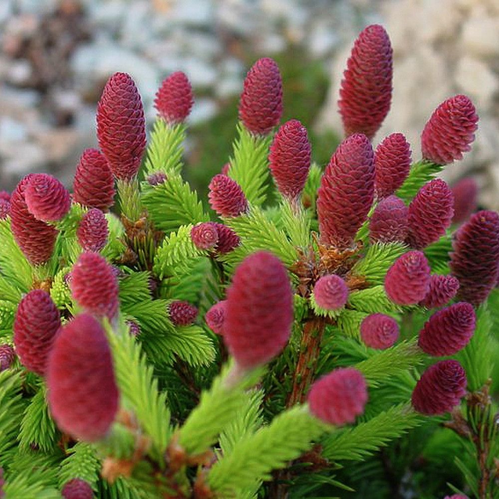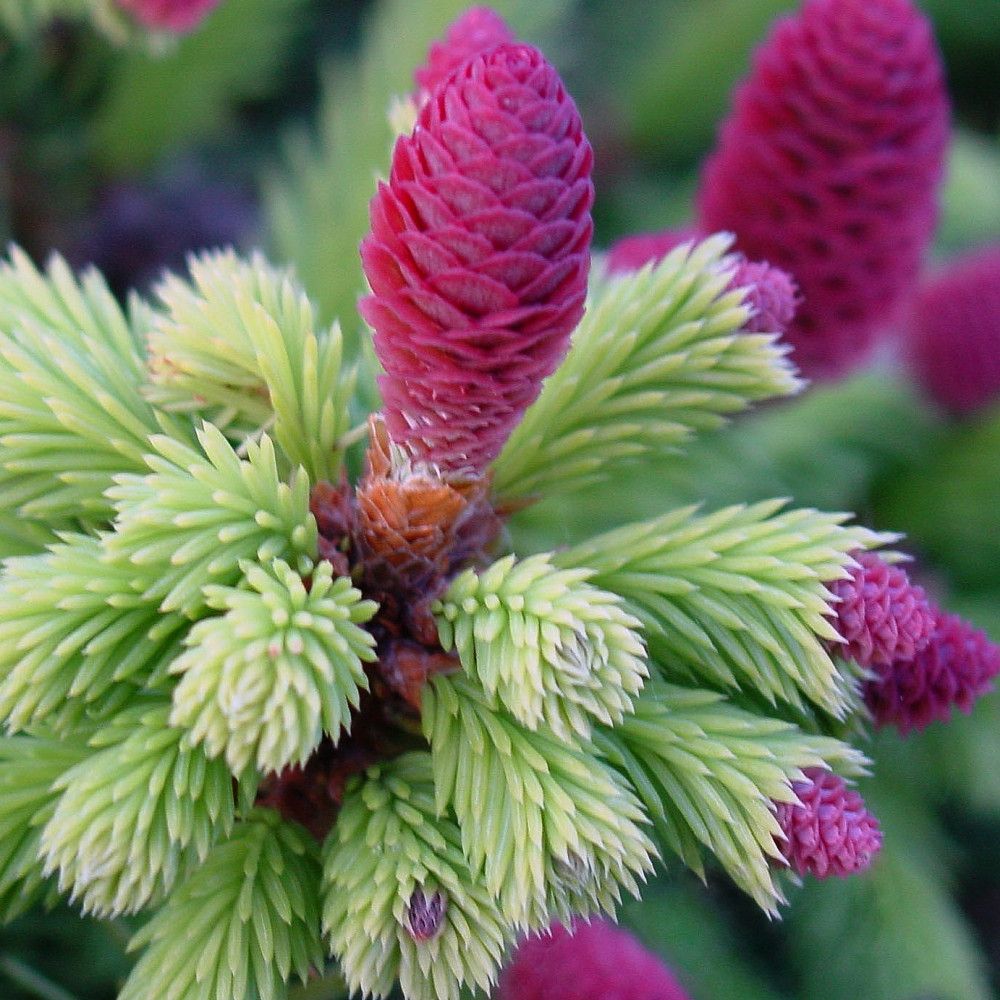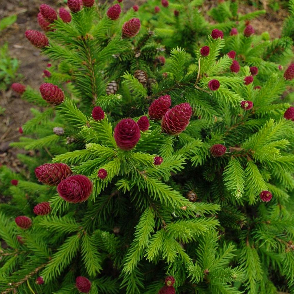 Весной на ели появляются плоды. Дерево начинает плодоносить с раннего возраста. Сначала формируются небольшие красные шишки округлой формы, которые затем принимают веретенообразную форму и изменяют цвет от бледно-розового до ярко-фиолетового.