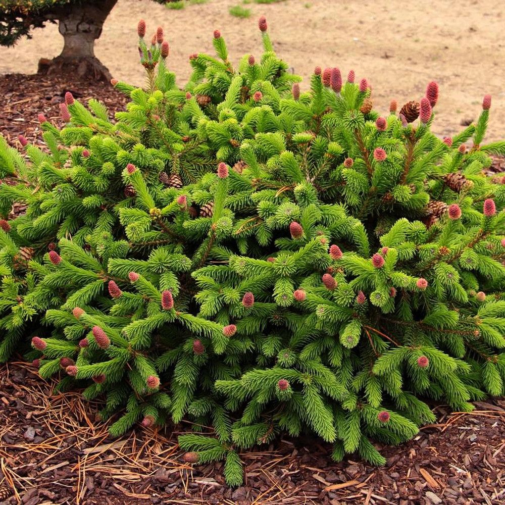 Когда ель плодоносит, она обильно усыпана яркими шишками. Миниатюрное дерево с разноцветными плодами выглядит очень выразительно. Взрослые коричневые шишки можно оставлять до весны, но если они не опадут сами, их нужно удалить, чтобы освободить место для новых завязей.