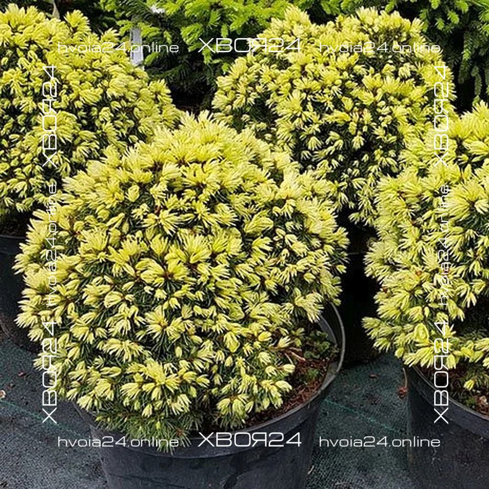 Ель сизая Дендрофарма Голд (Dendrofarma Gold) – это канадская ель, выведенная в Польше в 2000 году. Она отличается компактными размерами и карликовой высотой, что делает её идеальным выбором для небольших садов и альпинариев. Крона ели имеет пропорциональную форму купола и плотную структуру. Хвоя тонкая, короткая, нежная и мягкая на ощупь. Основная окраска хвои – зелёная, а молодые приросты обладают золотистым оттенком.