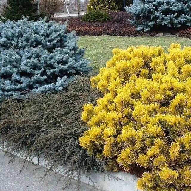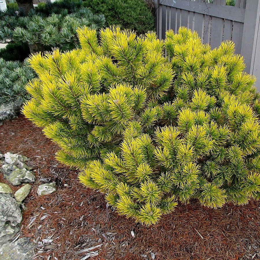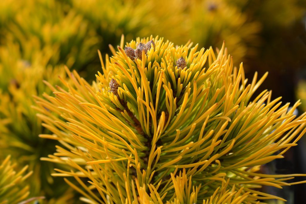 Сосна горная Винтер Голд — это изысканный хвойный хамелеон, представляющий собой компактный и плотный карликовый кустарник. В высоту он достигает одного метра, а в диаметре может разрастаться до полутора метров. Pinus mugo Winter Gold славится своей жесткой и короткой хвоей, которая летом радует глаз ярко-зеленым цветом, а зимой приобретает благородный оттенок чистого золота. Осенью зеленый шарик хвои сначала становится ярко-желтым, а к зиме приобретает коричневый цвет. На фоне унылого осеннего пейзажа и после схода снега это растение превращается в настоящую звезду сада. Декоративность ему придают небольшие коричневые шишки размером 2-4 см.