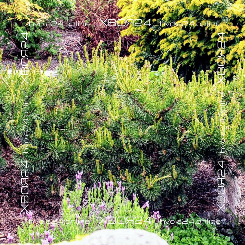 Посадочная яма делается из расчета две высоты и две ширины корневого кома, приобретенного растения. Если почва глинистая, то на глубину ямы необходимо поместить 10-20 см дренажа, например: гравий, керамзит, битый кирпич, щебень. Яму желательно наполнить специальным грунтом для хвойных растений или почвосмесью из расчета 1:2:2 (одна часть земли, две части торфа и две части песка). При посадке в яму можно добавить корневин или любой другой стимулятор корнеобразования, а так же ОМУ (органическое минеральное удобрение) для хвойных растений. Целостность корневого кома без необходимости не нарушать. Расположить саженец необходимо таким образом, чтобы корневая шейка растения не была заглублена. После посадки саженец хорошо поливают и мульчируют корой, щепой, хвойным опадом или опилками. Если в приготовленную почвосмесь не добавлялось ОМУ для хвойных растений, то под мульчу можно заделать в грунт любое минеральное удобрение для хвойный растений. Все карликовые сорта удобряются из расчета 30% от нормы указанной производителем. Сосны привитые на штамб необходимо закрепить на опору чтобы помочь растению противостоять снеговым и ветровым нагрузкам.