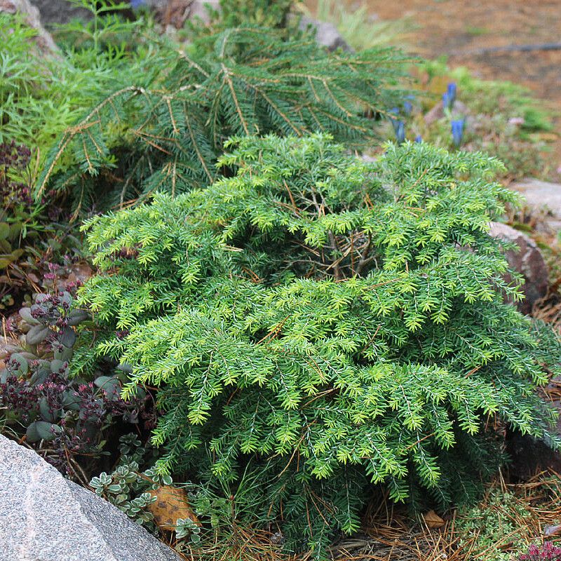 Тсуга канадская Джедделох – медленнорастущий вид тсуги, который через 10 лет достигает высоты около 0,4 м и диаметра около 0,6 м. Это растения, которые отличаются неприхотливостью и устойчивостью к заболеваниям. Даже в молодом возрасте тсуги обладают компактной и густой кроной. Их побеги, расположенные радиально, создают характерное углубление в центре кустарника, напоминающее гнездо. Иглы мелкие, ярко-зеленые. Тсуга предпочитает плодородную и влажную почву, а также участки, защищенные от ветра. Это идеальный выбор для небольших садов, альпинариев и лужаек.