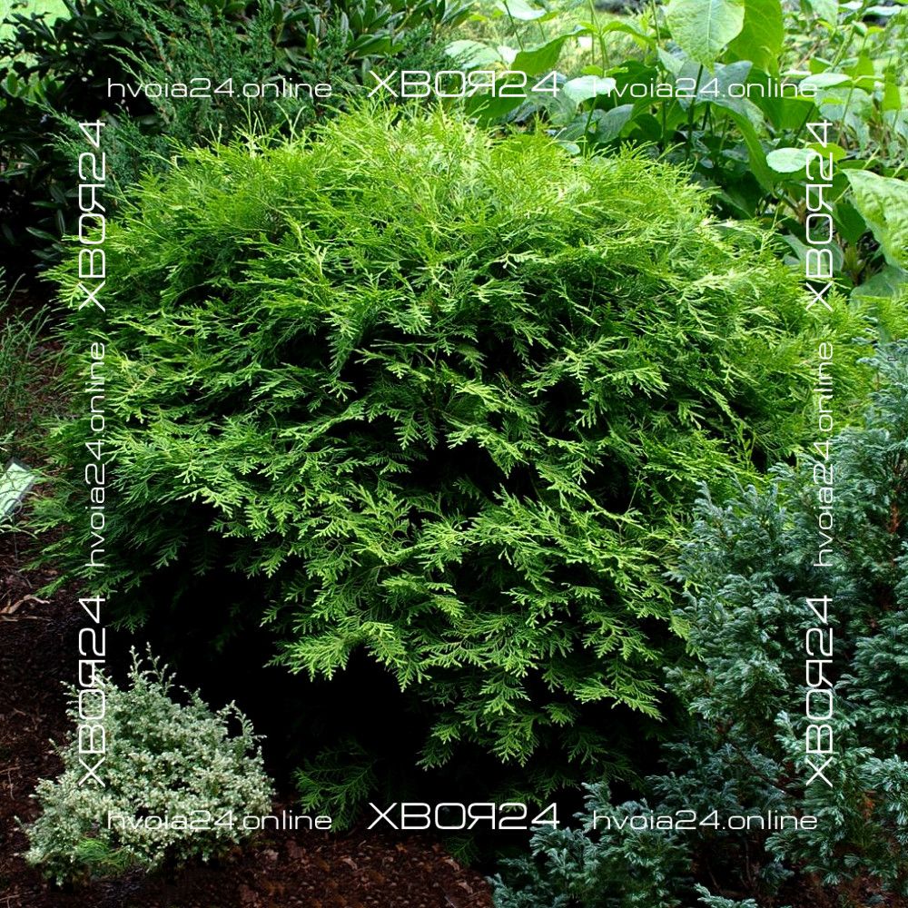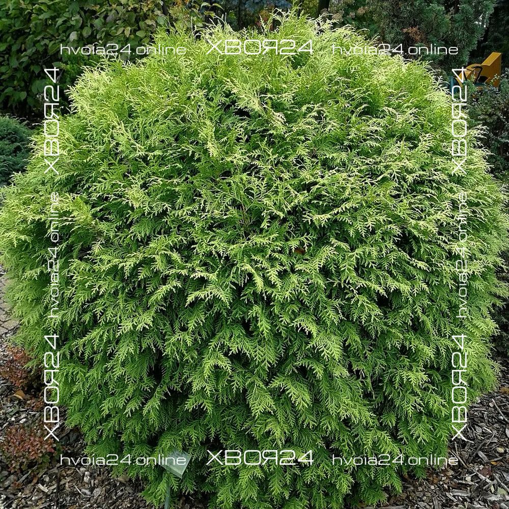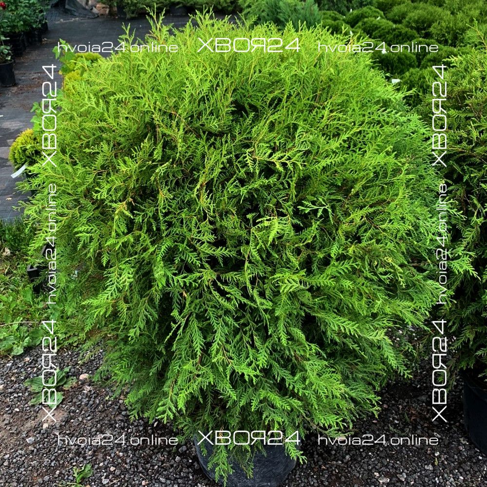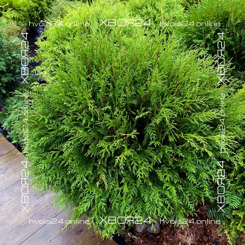 Туя западная Глобоза (Globosa) – первая и самая крупная из округлых форм, напоминающая огромный лохматый шар. Она была получена в 1874 году и впервые описана Р. Смитом. Вечнозеленый кустарник крупный и способен вырастать до 2х2 м. Растет сравнительно медленно 15-20 см в год (в 10 лет всего около 1 м). В молодом возрасте больше напоминает овальную колонку, но по мере развития постепенно расширяется, становясь все более округлой. Крона значительно плотнее родительского растения и имеет близко посаженные веточки, но, все же, она требует раз в 2 года формирующей стрижки для придания большей аккуратности. Хвоя мягкая равномерного зеленого цвета. В зимний период хвоинки буреют или становятся сероватыми. Поэтому не бойтесь этого, с вашей туей ничего не случилось!