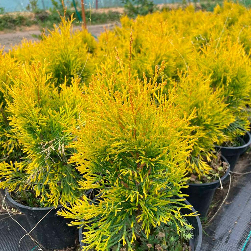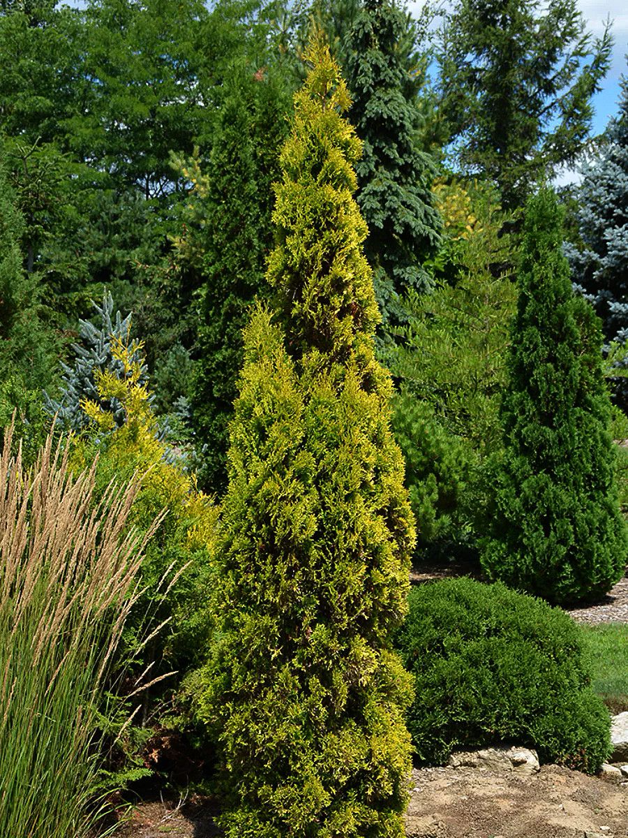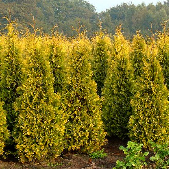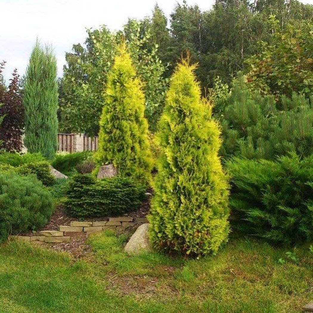 Окрас хвои гармонично смотрится с другими вечнозелеными сортами, а также туя легко может стать центром композиции.