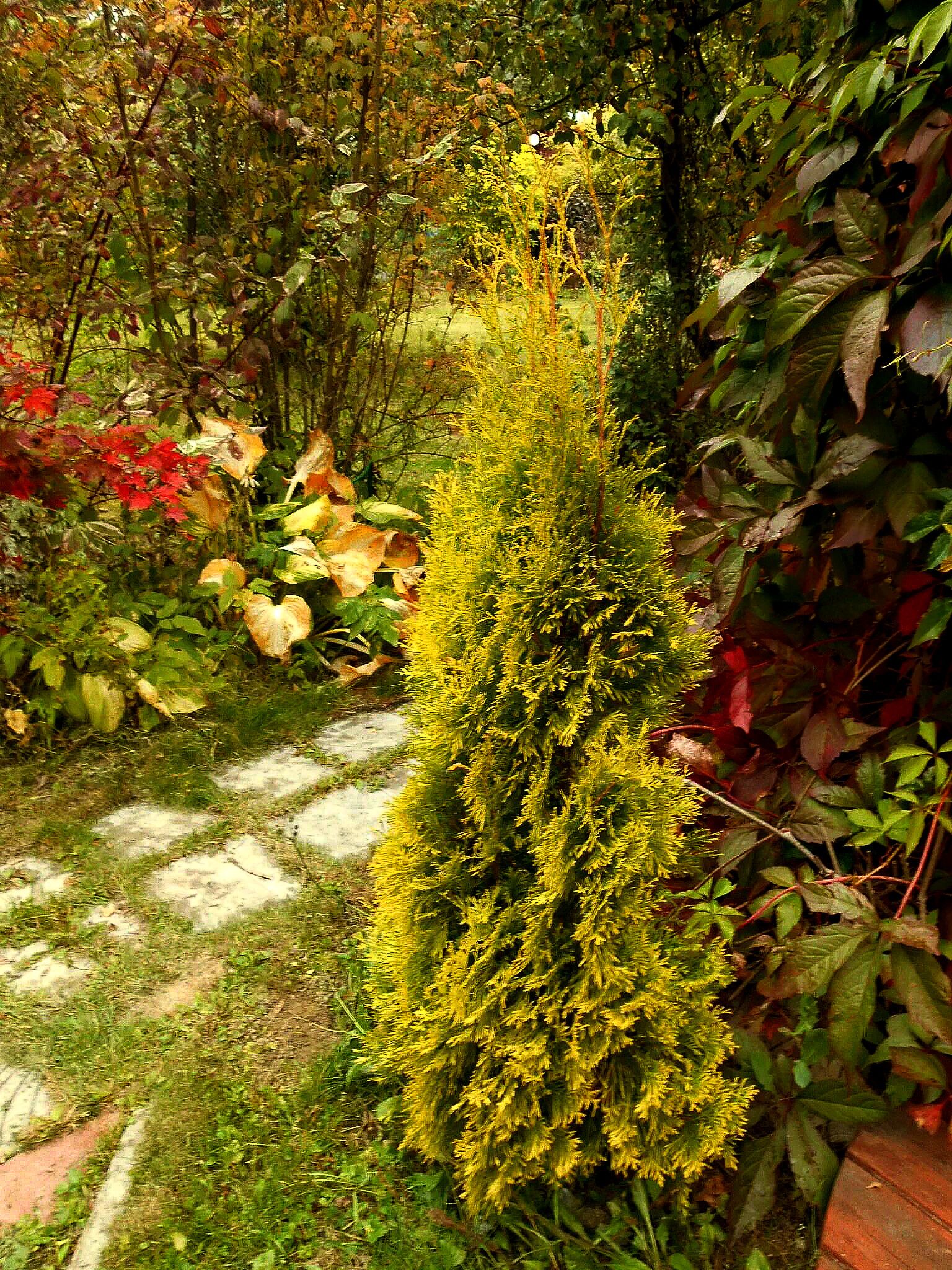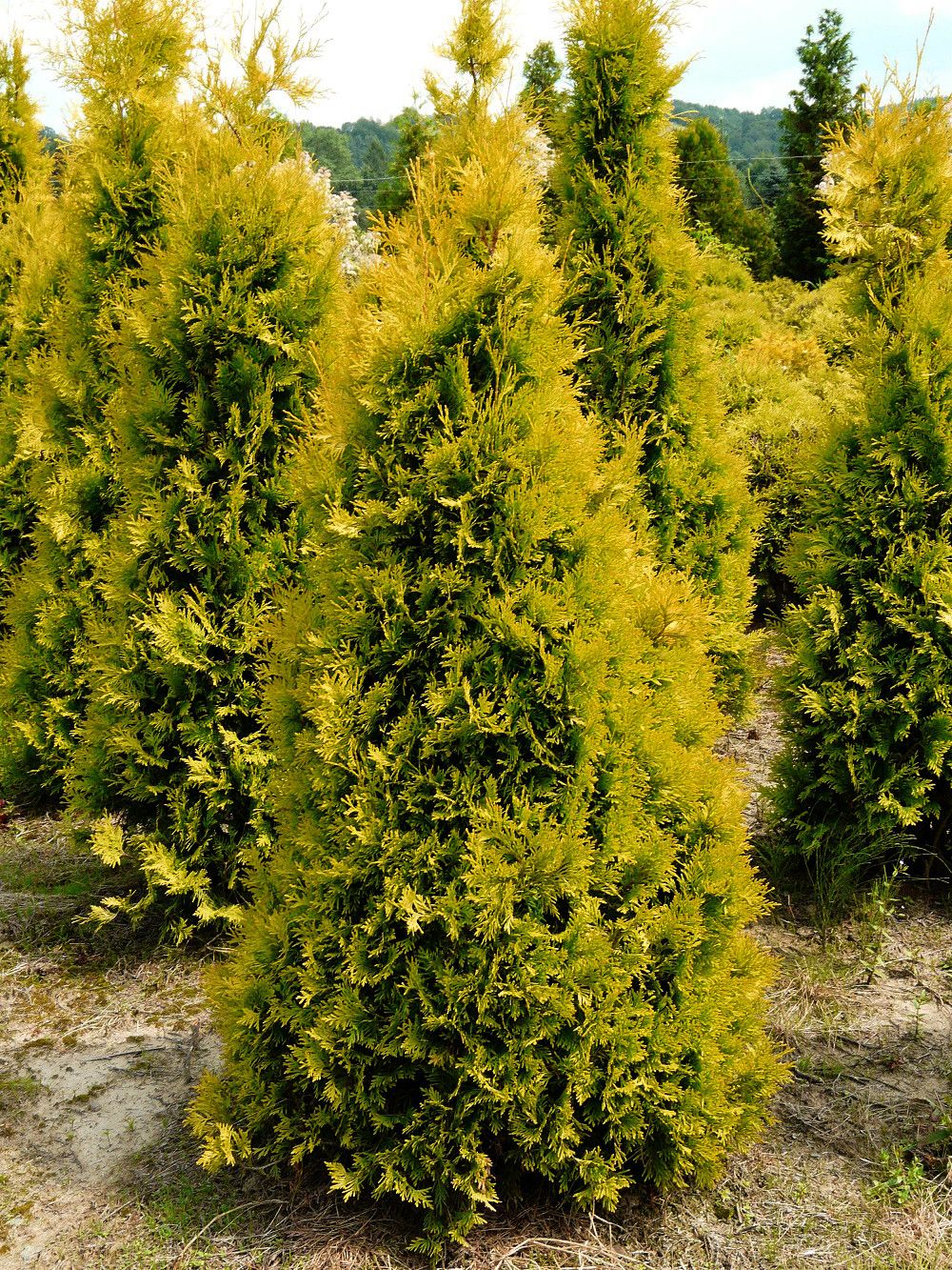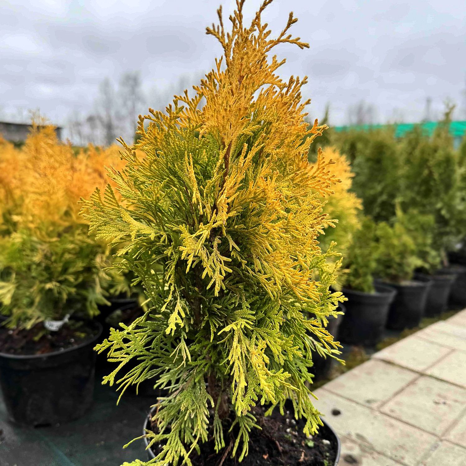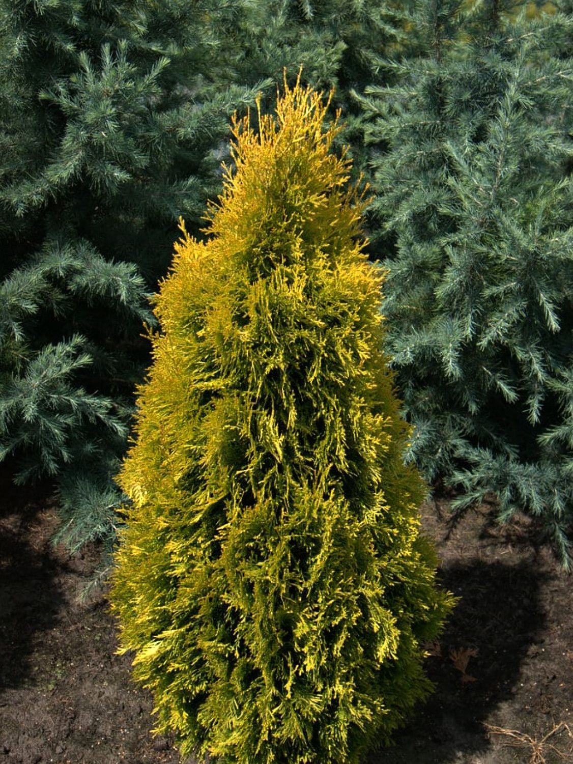 Окрас хвои гармонично смотрится с другими вечнозелеными сортами, а также туя легко может стать центром композиции.