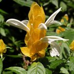 Цветение пахистахиса можно назвать ослепительным. Верхушечные колоски соцветий состоят из плотно расположенных желтых прицветных листьев с ярким солнечно-желтым оттенком. Четырехгранные соцветия напоминают лучистые пирамидки со строгим геометрическим строением и могут достигать длины до 10 см. Настоящие цветки пахистахиса белые, трубчатые, с тонким венчиком, разделенным на узкие доли. Они выглядывают между прицветниками, придавая растению экзотический вид.