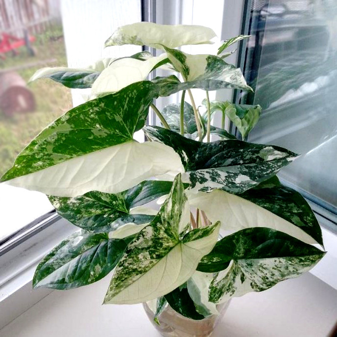 Сингониум Империал Вайт представляет собой вариегатный сорт средней высоты, отличающийся медленным ростом и лиановидной формой. Листья этого растения могут достигать длины до 20 см и имеют сердцевидную форму. Их окраска варьируется от полностью белой до белой с зелеными прожилками и краями. Листья часто украшены пятнистым узором. Молодые стебли сингониума имеют зеленый цвет, который со временем меняется на коричневый. Диаметр стеблей обычно составляет 1-2 см.