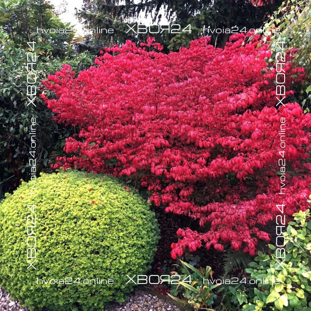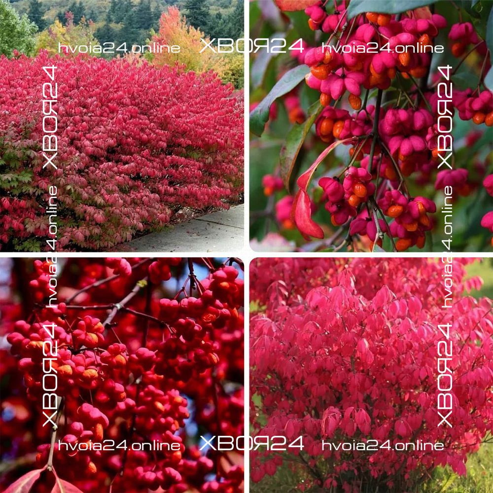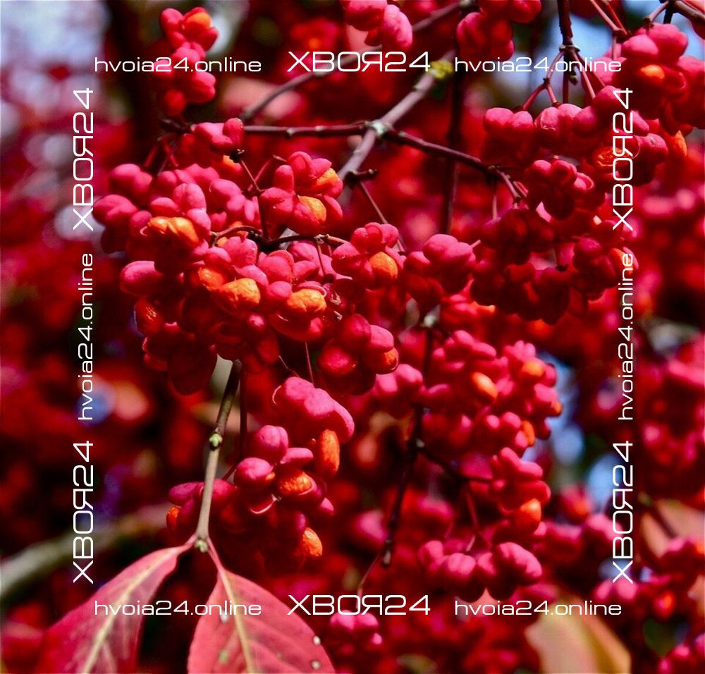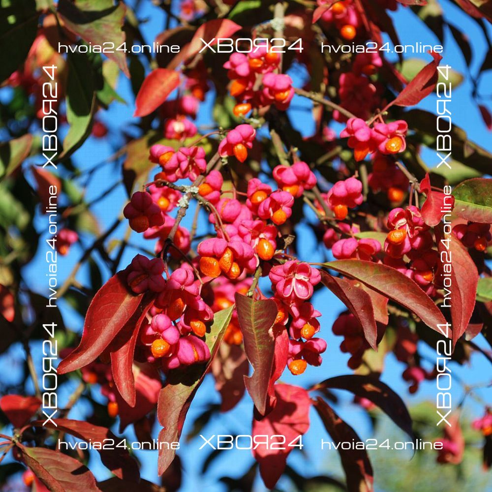 Плодоношение начинается в конце лета. К сентябрю коробочки окрашиваются в розово-красный или тёмно-красный цвет, а при полном созревании раскрываются, демонстрируя ярко-оранжевые семена. Плоды держатся на ветвях долго, иногда до зимы. На фоне яркой осенней листвы они выглядят особенно эффектно, придавая кустарнику насыщенные декоративные акценты.