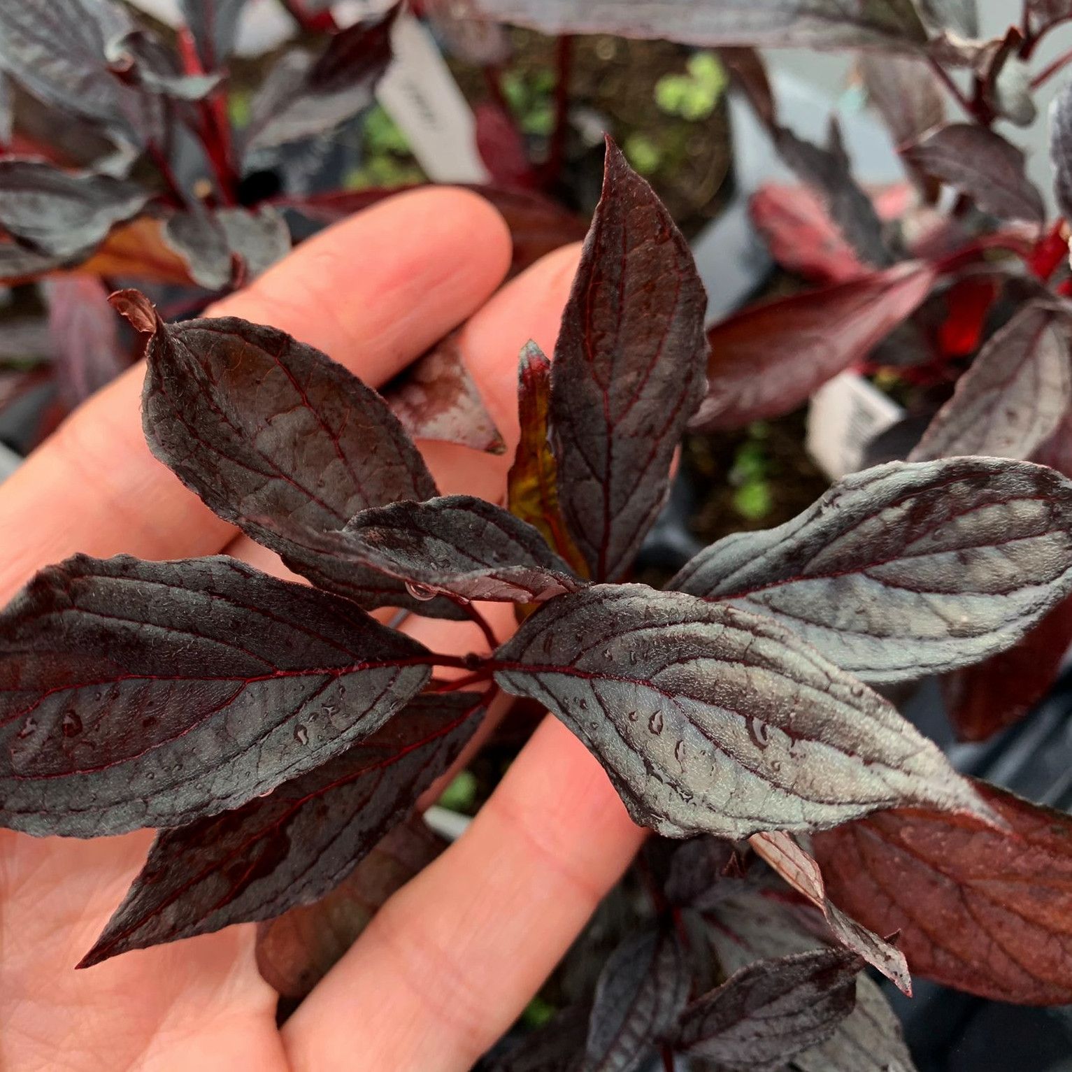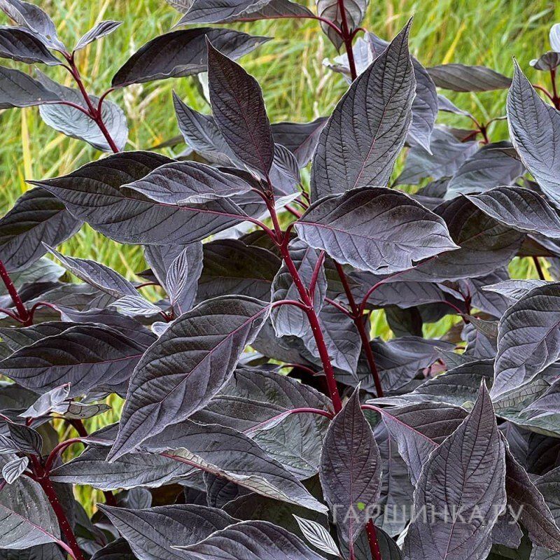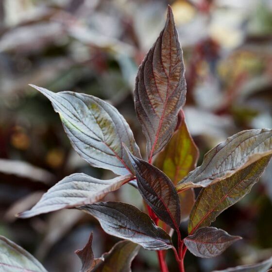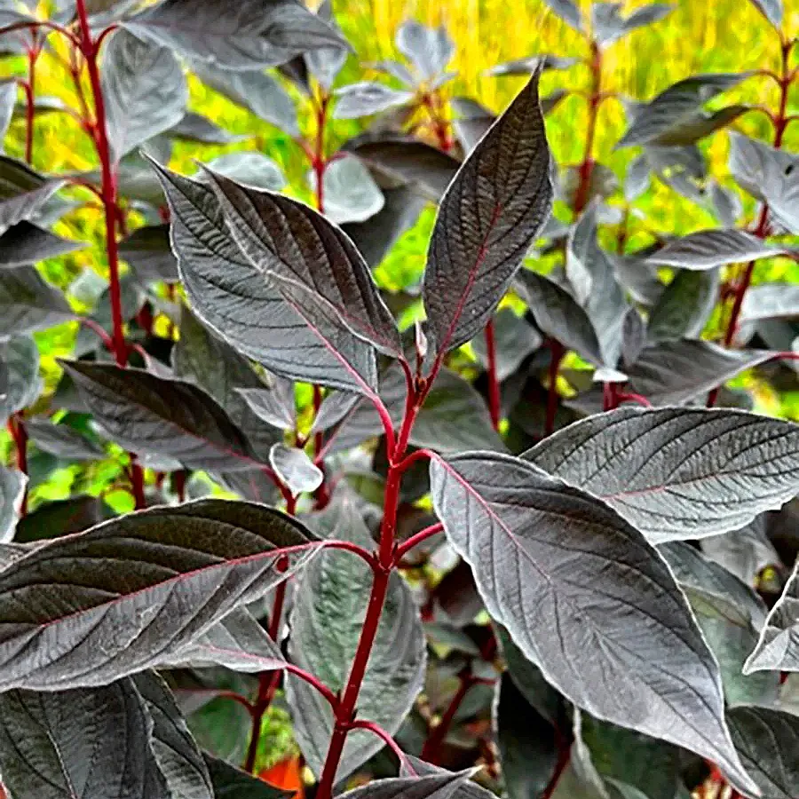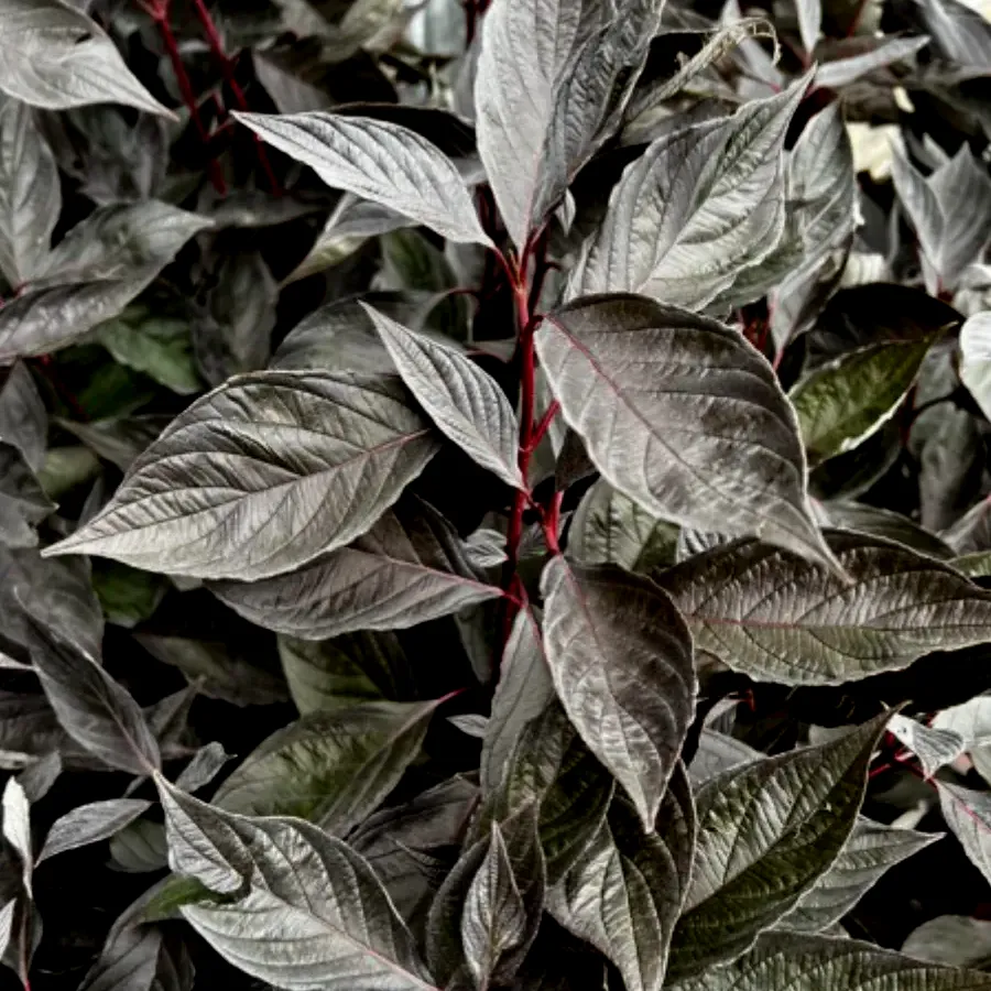 Дерен белый Найтфолл сравнительно небольшого размера около 1,5х1,5 м. Листья его весной имеют насыщенный темно-зеленый цвет, который в летние месяцы становится темно-фиолетовым, а осенью приобретают яркие оттенки, создавая необыкновенный контраст. Серый бархатистый налет на нижней стороне листьев добавляет особую текстуру, а вишневые ветви, которые прекрасно проглядываются зимой, делают дерен “Найтфолл” привлекательным даже в холодные месяцы. Отдельно стоит отметить игру винных прожилок на бархатистом листе, такой игры красок не встретишь ни у какого другого дерена. Листочки у этого сорта напоминают лодочку, причем слегка сложенную вдвое. У них волнистые тонкосеребристые края в разгар сезона. Побеги прямостоячие, молодые – зелено-бронзовые, далее они окрашиваются в винно-красный оттенок, сохраняемый до 2 лет.