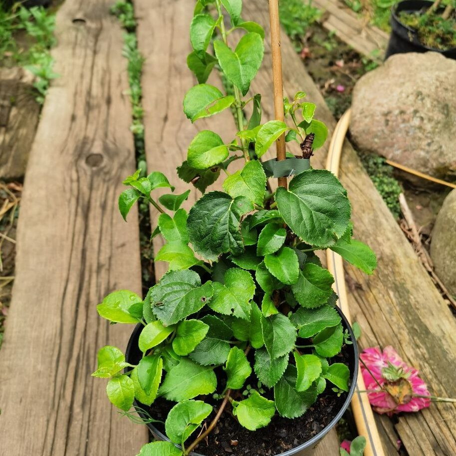 Гортензия считается быстрорастущей культурой, ежегодно прибавляя в длину от 0,5 до 1 метра. Её ветви покрыты коричневато-красной корой, а густая листва позволяет ей оплетать опорные конструкции уже в середине апреля.
