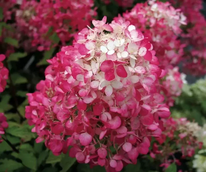 Соцветия крупные и пышные, до 30-40 см в длину. Форма широкопирамидальная с широким основанием и приплюснутым конусом, который выглядит почти шарообразным. С начала июля цветки раскрываются чисто белыми, затем розовеют и к августу становятся насыщенно-красными, сохраняя яркость на несколько недель.
