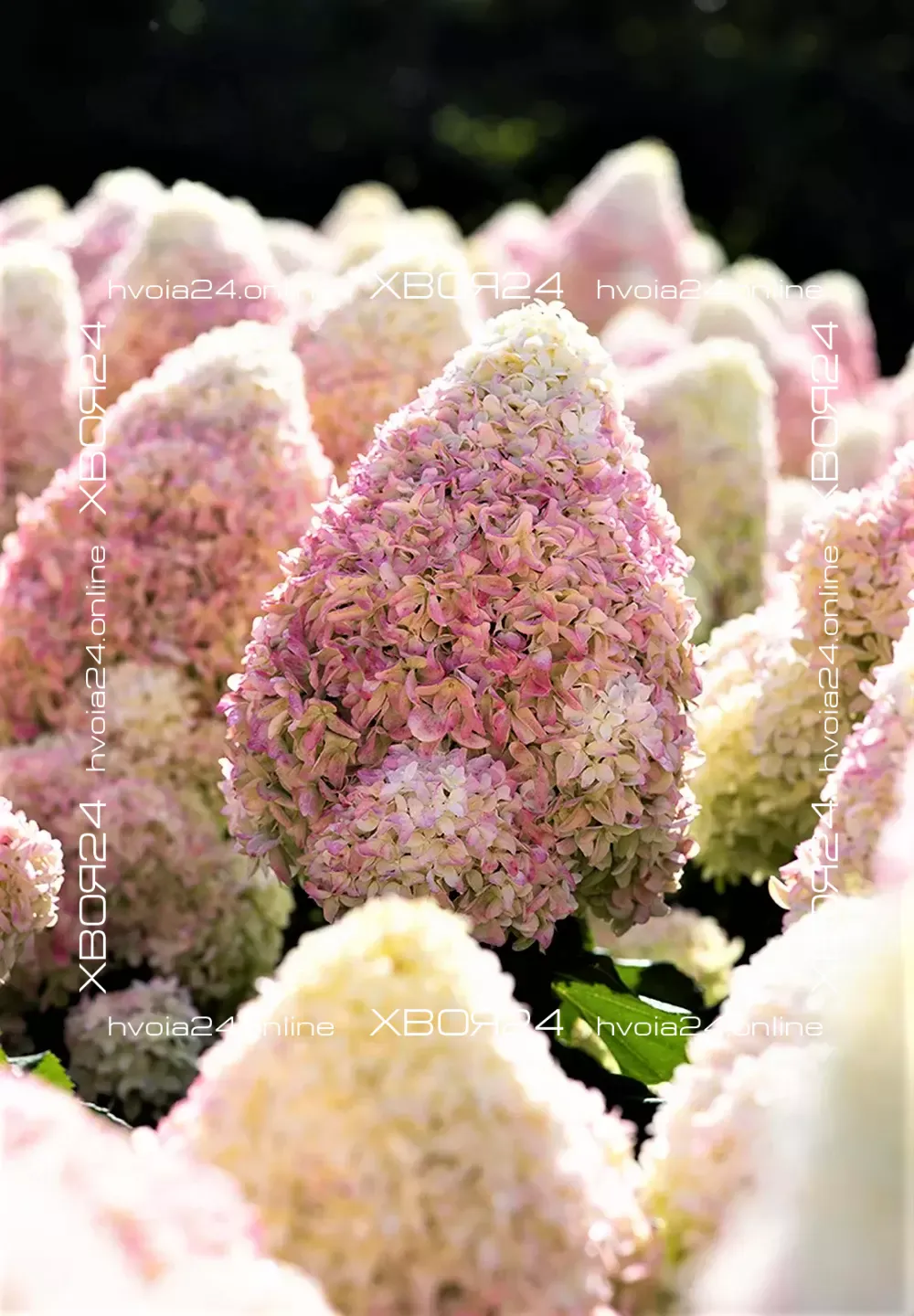 Соцветия очень плотные и пышные. В начале цветения они стерильные, белые, затем розовеют, а в конце становятся тёмно-розовыми. Размер каждого соцветия составляет 20–25 см. Цветение обильное и продолжительное, начиная с июля и заканчивая в сентябре.