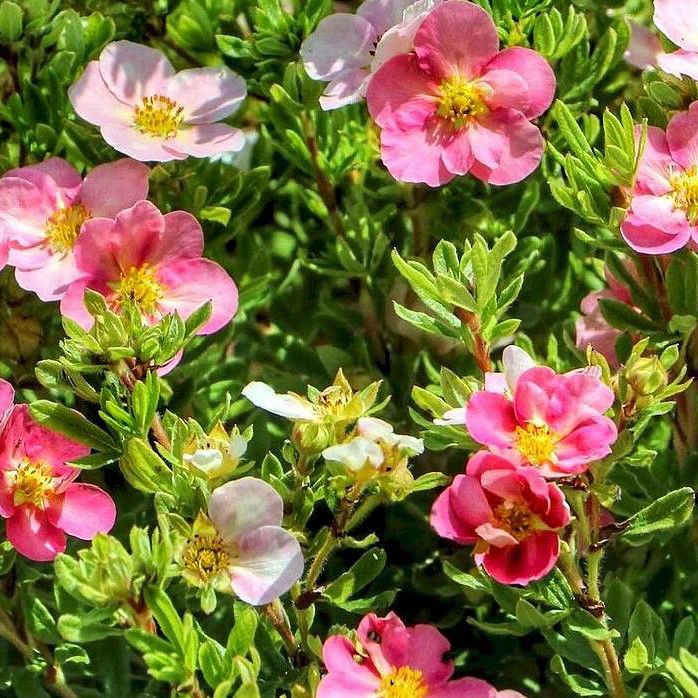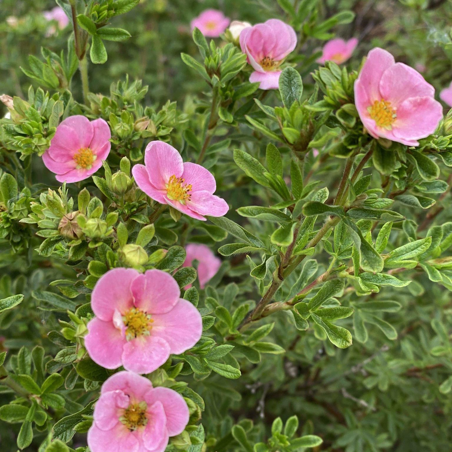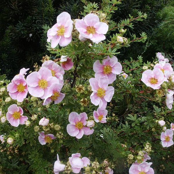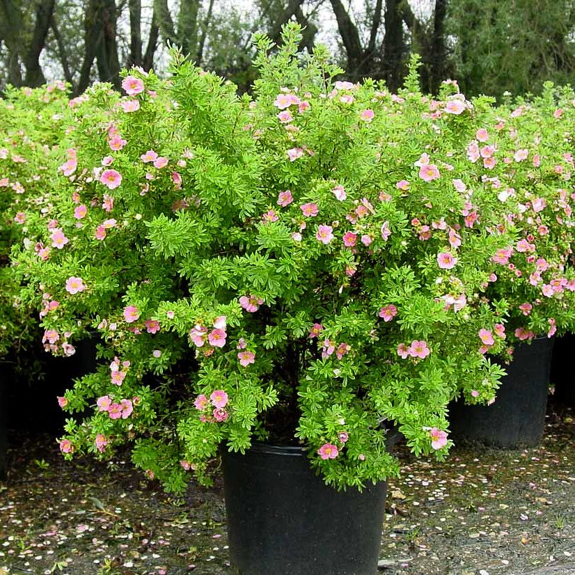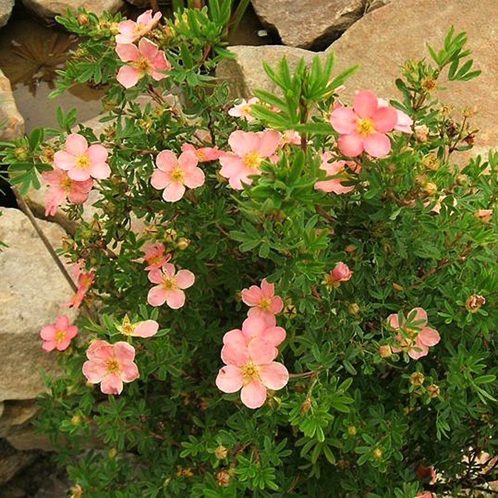 Лапчатка кустарниковая Пинк Квин (Pink Queen) — это невысокий, компактный кустарник, который может достигать высоты до 80 см. Ширина куста может составлять до 120 см. Растение отличается быстрым ростом: средний годовой прирост составляет около 20 см.