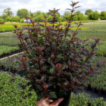 Крона у него плотная, по конфигурации напоминает перевернутый конус. Побегов много, их расположение густое. Растут ветви вертикально, цвет у них коричнево-красный. Степень облиственности у растения значительная. Конфигурация листвы трехлопастная, есть глубокие разрезы. На краях листьев присутствуют зазубрины, они довольно мелкие. В их окраске зеленый оттенок сочетается с бордовым и фиолетовым, к осени он становится более темным – коричнево-пурпурным. Молодые листья зеленые, с легким красноватым отливом. Окраска претерпевает изменения с течением времени.