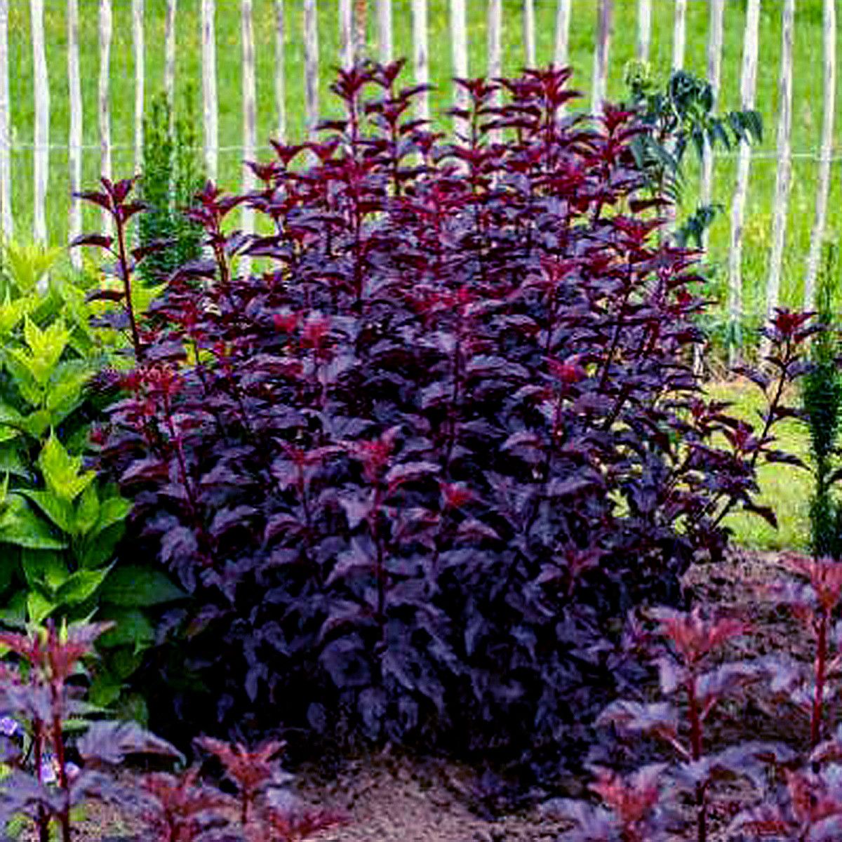 Цветки кустарника белые, а листья остаются темно-красными даже осенью. Растение может достигать высоты до 1,5 метров, а при благоприятных условиях — до 2 метров. Однако его рост обычно регулируется обрезкой, что позволяет поддерживать желаемую форму.