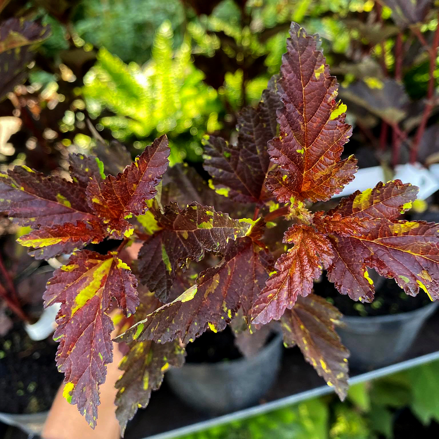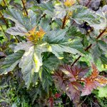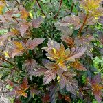 Пузыреплодник калинолистный Саламандра – декоративный листопадный кустарник вырастающий до 2,5-3 м в высоту и ширину. Листья бордовые, с золотисто-желтыми и зелеными пятнами. Лучше всего изменение цвета заметно на молодых приростах, поэтому рекомендуется сильная обрезка этого сорта. Цветы этого пузыреплодника кремово-белые, собраны в полусферические соцветия. Цветение Мефисто начинается в конце июня и продолжается в июле. Длительность цветения около 4 недель. Пузыреплодник калинолистный Саламандра – растение, подходящее для любого сада. Отличный сорт для шпалеры и живой изгороди. Из-за устойчивости к загрязнениям воздуха он подходит для городских посадок. Пузыреплодник с огненной оранжево-красной листвой особенно выигрышно смотрится в сочетании с хвойными растениями, оттеняя их сочную зелень. Этот необычный микс сразу же бросается в глаза, поэтому чаще всего становится центром ландшафтной композиции, в окружении других декоративных культур. Саламандра очень декоративно смотрится и при одиночной посадке, превращаясь в центральное украшение сада. Посадку лучше делать на хорошо освещенных участках (допускается легкая полутень) с легкой, рыхлой и плодородной, дренированной почвой. Кустарник нетребователен к условиям выращивания, но не переносит застой влаги в почве. Морозостойкость сорта хорошая, зона 4 (до -34°С).