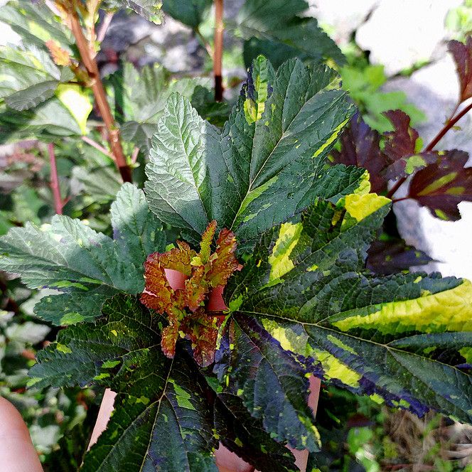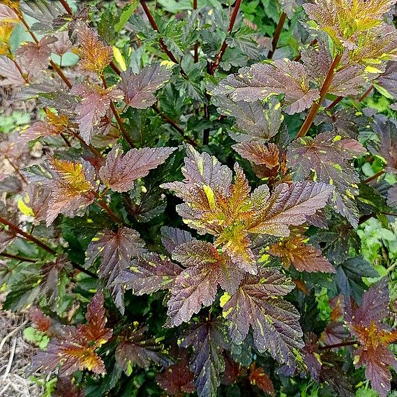 Сорт получен в Польше в 2014 г. Характерной и декоративной особенностью сорта являются бордово-зеленые листья, испещренные многочисленными золотисто-желтыми, аквамариновыми и зелеными пятнами. Лучше всего изменение цвета заметно на молодых приростах, поэтому рекомендуется сильная обрезка этого сорта. Вырастает примерно до 2,5 м в высоту и ширину. Цветет на рубеже июня и июля. Кремово-белые цветки собраны в полусферические зонтики.
