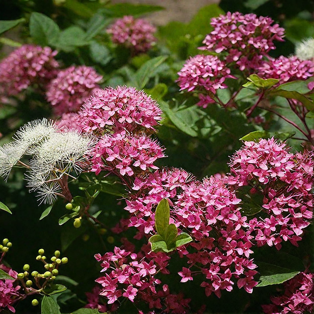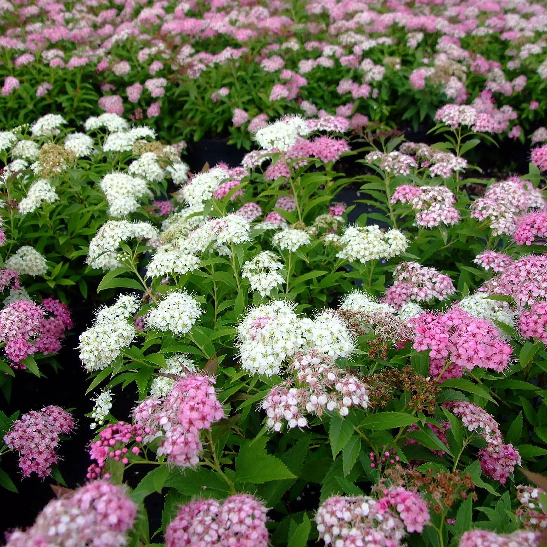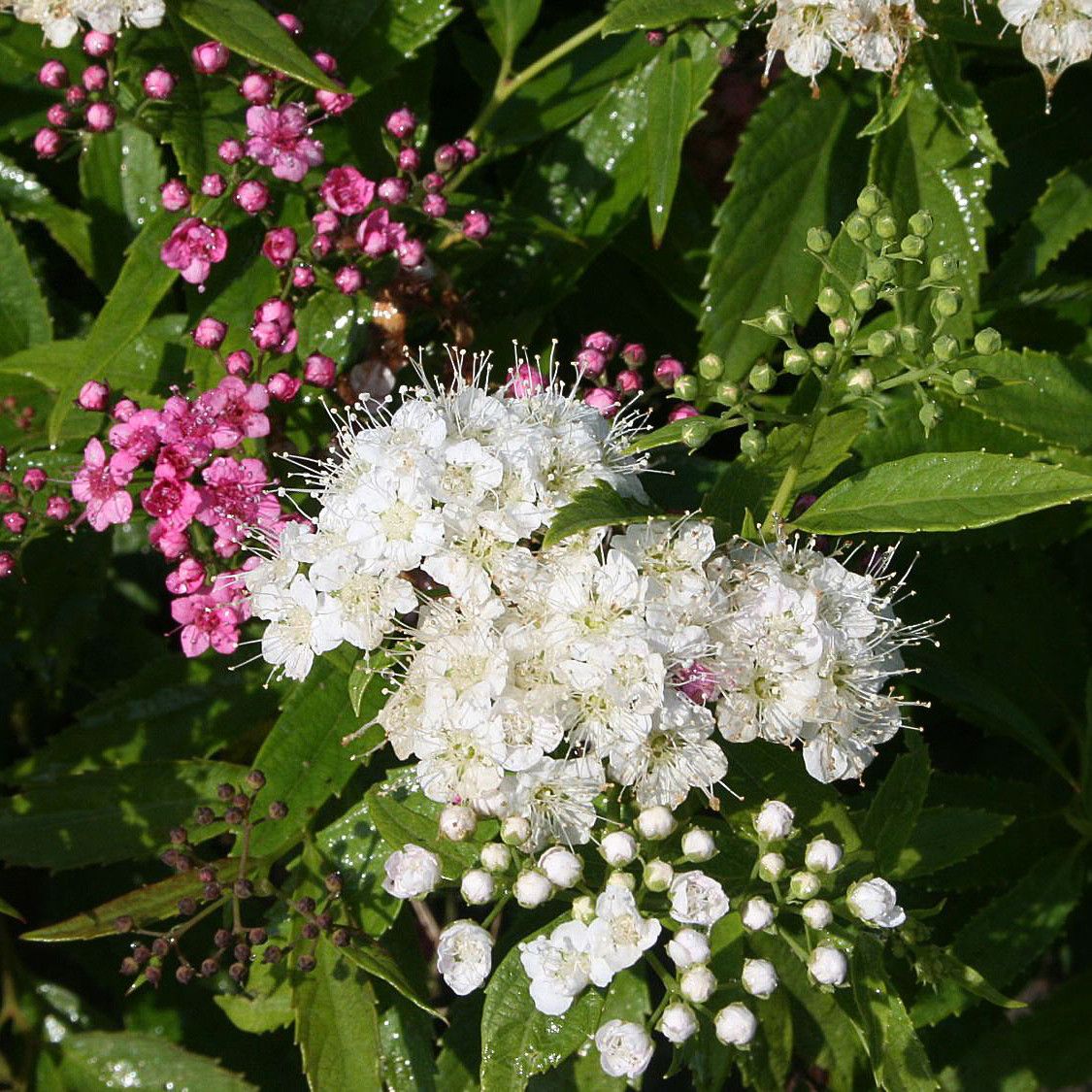 Удивительна японская спирея Genpei тем, что цветет розовыми, белыми и красными цветами на одном кусте. Встречается как трехцветная, так и двухцветная окраска цветов. Период цветения длится до самой осени.