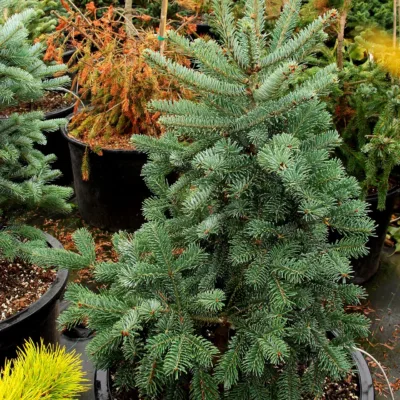 Новинка!!! С потрясающими декоративными качествами!!! Карликовая пихта, форма коническая с серебристо-голубой хвоей. Молодые приросты нежно-салатового цвета. Образует шишки уже в молодом возрасте. Растёт очень медленно.